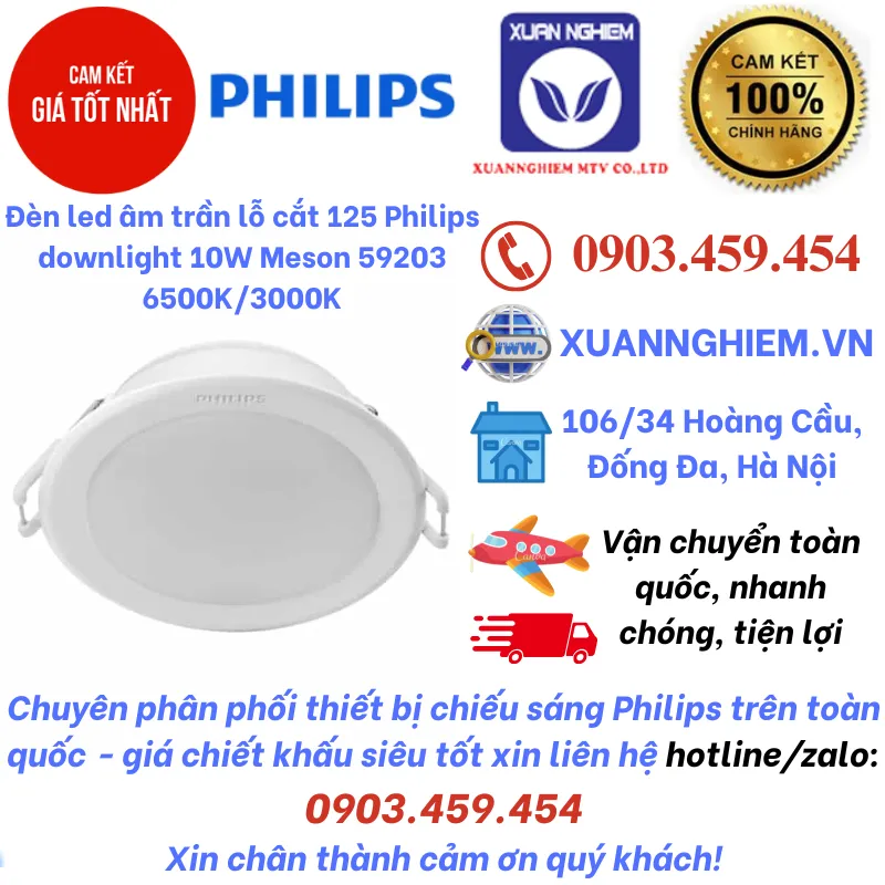 Đèn led âm trần lỗ cắt 125 Philips downlight 10W Meson 59203 6500K/3000K