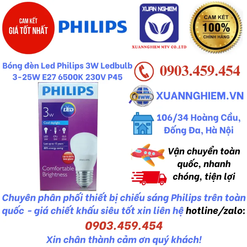 Bóng đèn Led Philips 3W Ledbulb 3-25W E27 6500K 230V P45