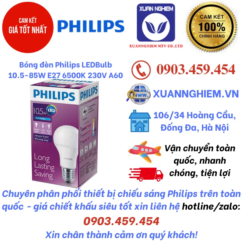 Bóng đèn Philips LEDBulb 10.5-85W E27 6500K 230V A60