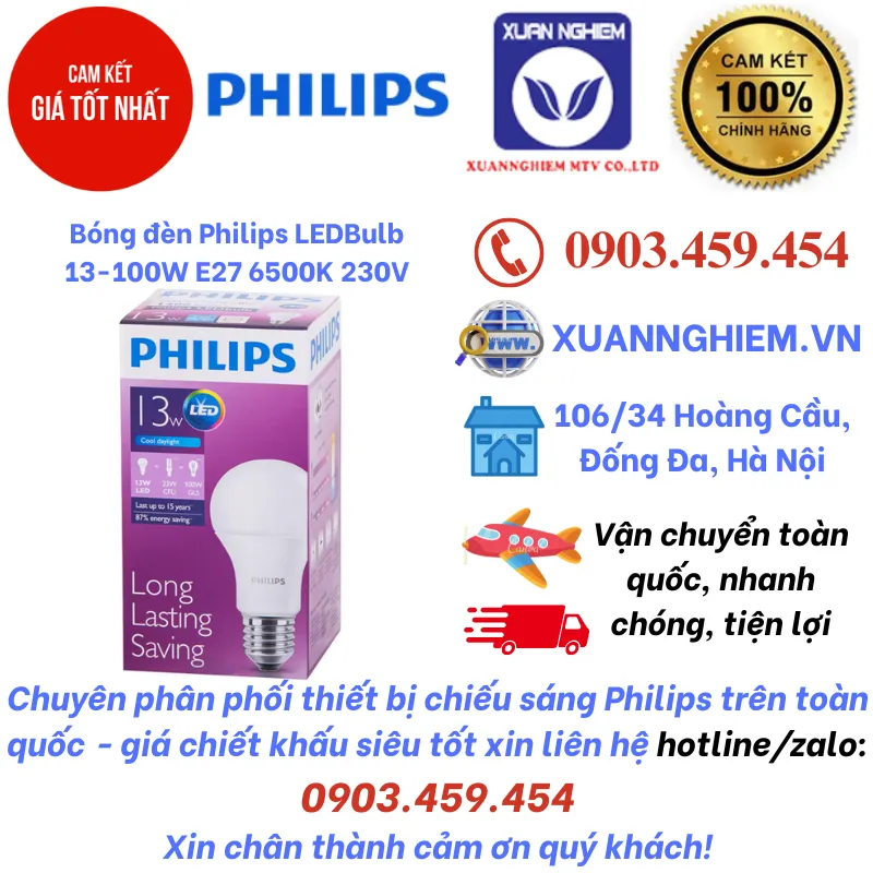 Bóng đèn Philips LEDBulb 13-100W E27 6500K 230V