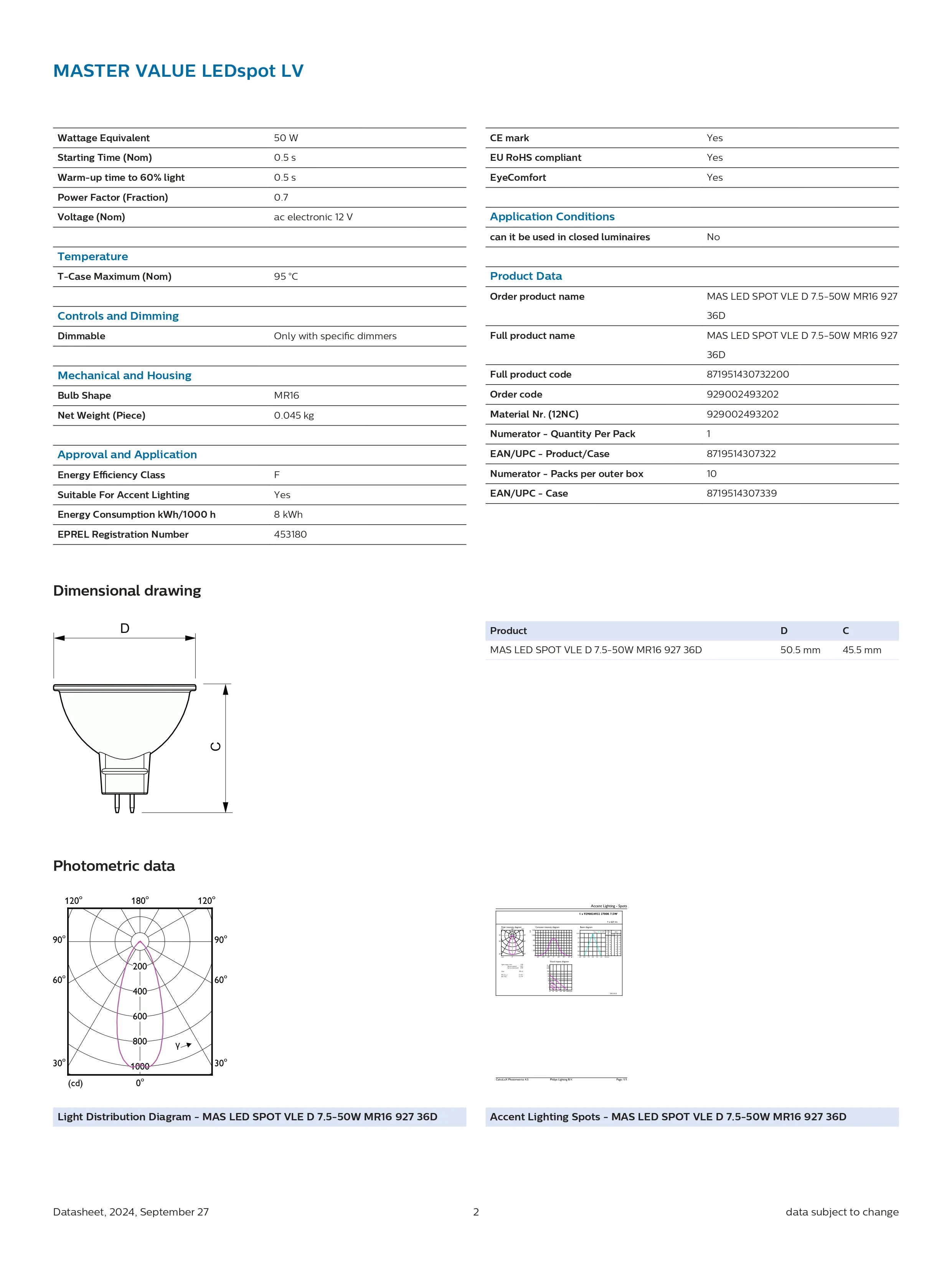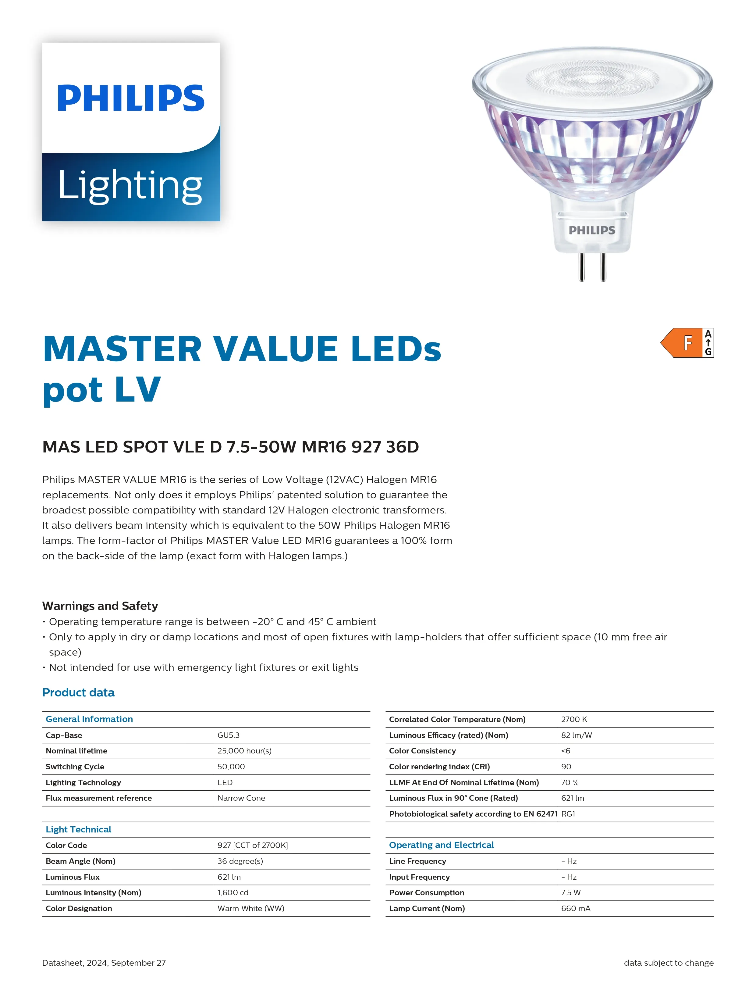 Bóng đèn Philips MAS LED spot VLE D 7.5-50W MR16 927 36D